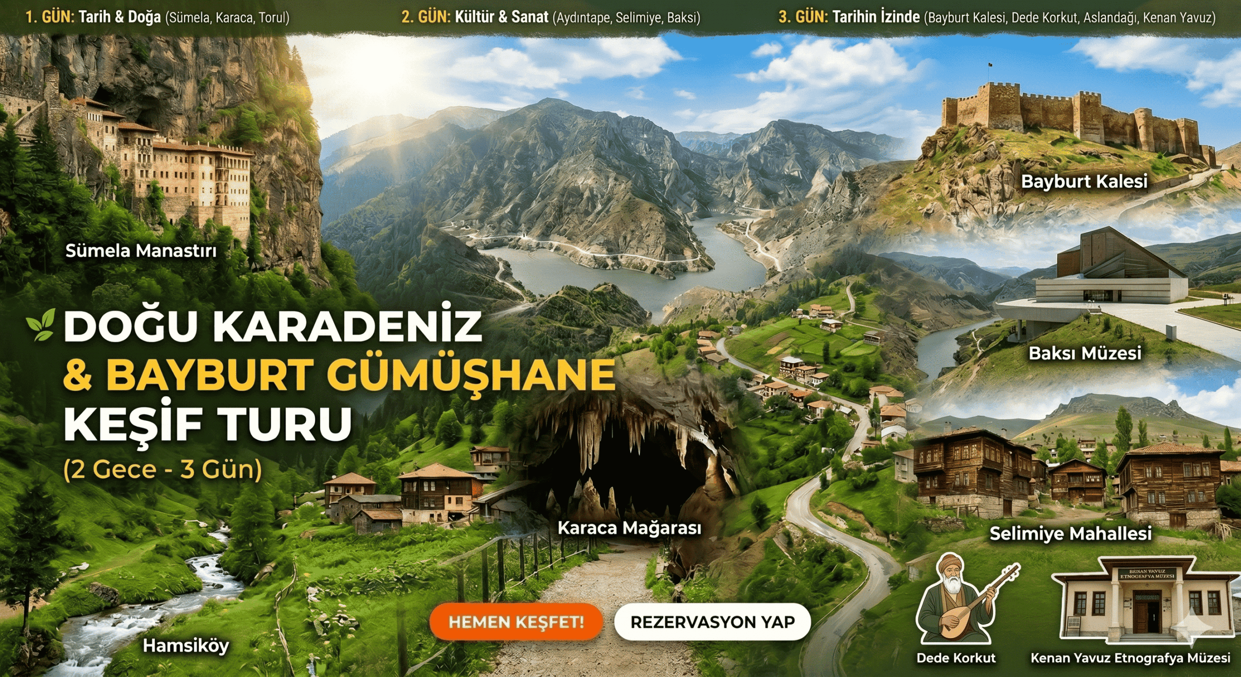 İlk durağımız görkemli yapısıyla Bayburt Kalesi olacaktır. Ardından Türk kültürünün önemli figürlerinden esinlenen Dede Korkut Müzesi gezilecektir. Sonrasında doğa ile iç içe bir mola için Aslandağı ziyaret edilir. Turumuz, özgün yapısıyla dikkat çeken Kenan Yavuz Etnografya Müzesi ile sona ermektedir. Sonrasında Trabzona geri dönüş yolculuğuna başlıyoruz.